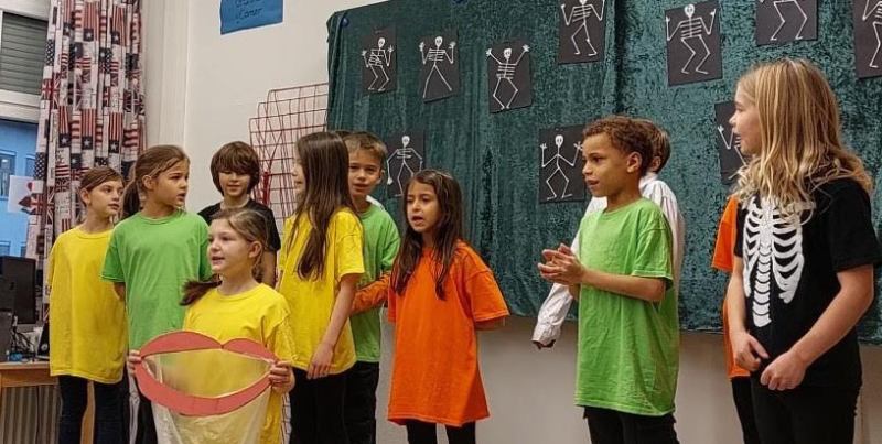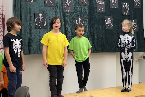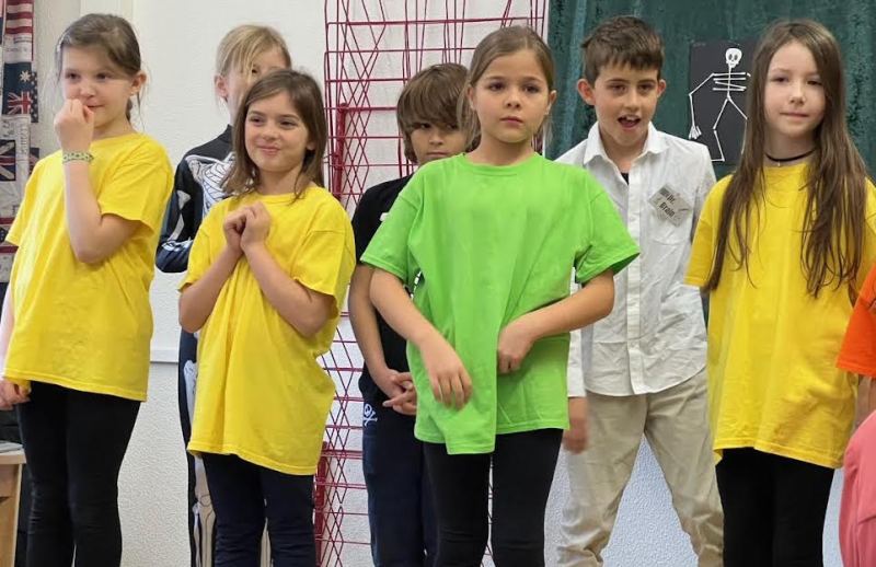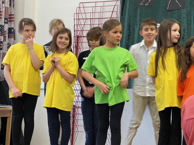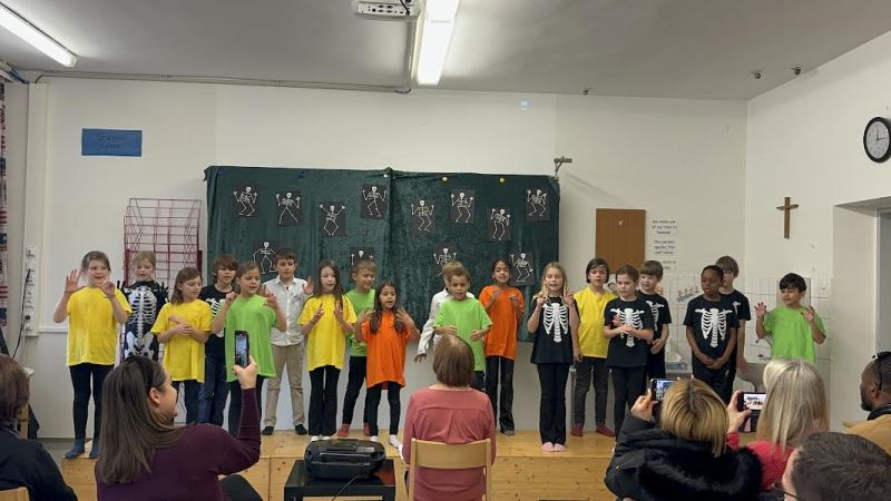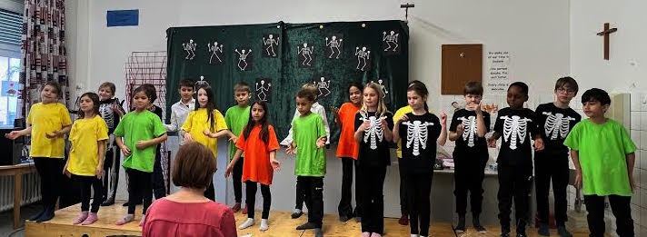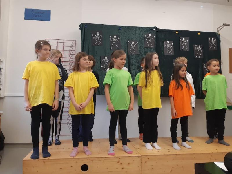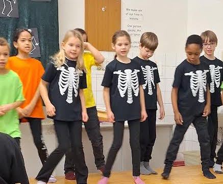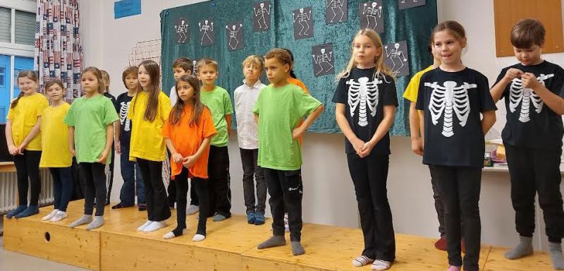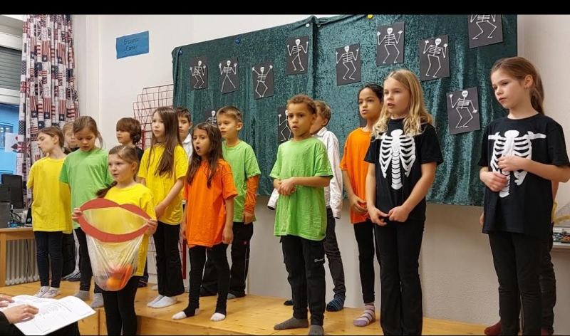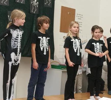 The “children” in our musical were brightly dressed in contrast to the black and white Skellytones. At the beginning they were shocked to see Mr Skellybones, with arms and legs like sticks of macaroni. Was that really what is inside our bodies, they asked themselves? Good thing that we sang about hands, fingers, arms, feet, the tummy, heart and brain, too. We got to find out a great deal about the human body, and the musical ended with the recommendation that we go and buy a book about anatomy.