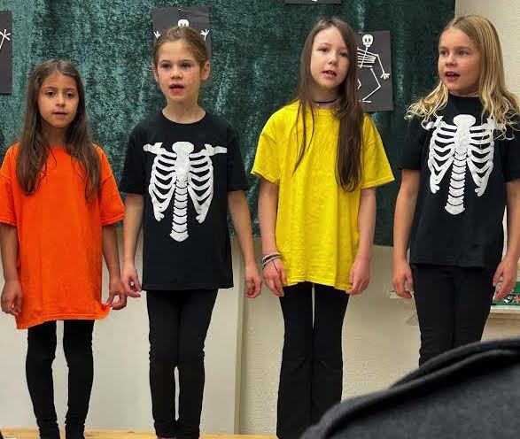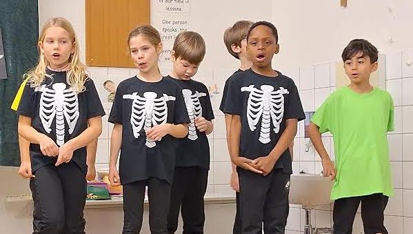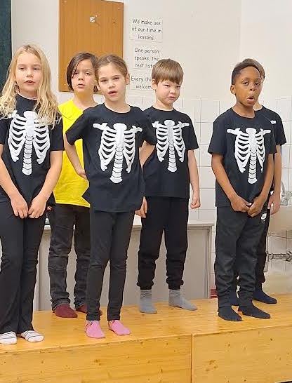 Our Mr Skellybones was actually Mrs Skellybones and she asked her friends the Skellytones to teach “children” something about her body. No one stayed still on the stage for long. There were movements to learn and dances to remember, too. We had great fun rehearsing the Skeleton Rock. How long did it take us all to move right and then left at the correct time! We won’t answer that question!