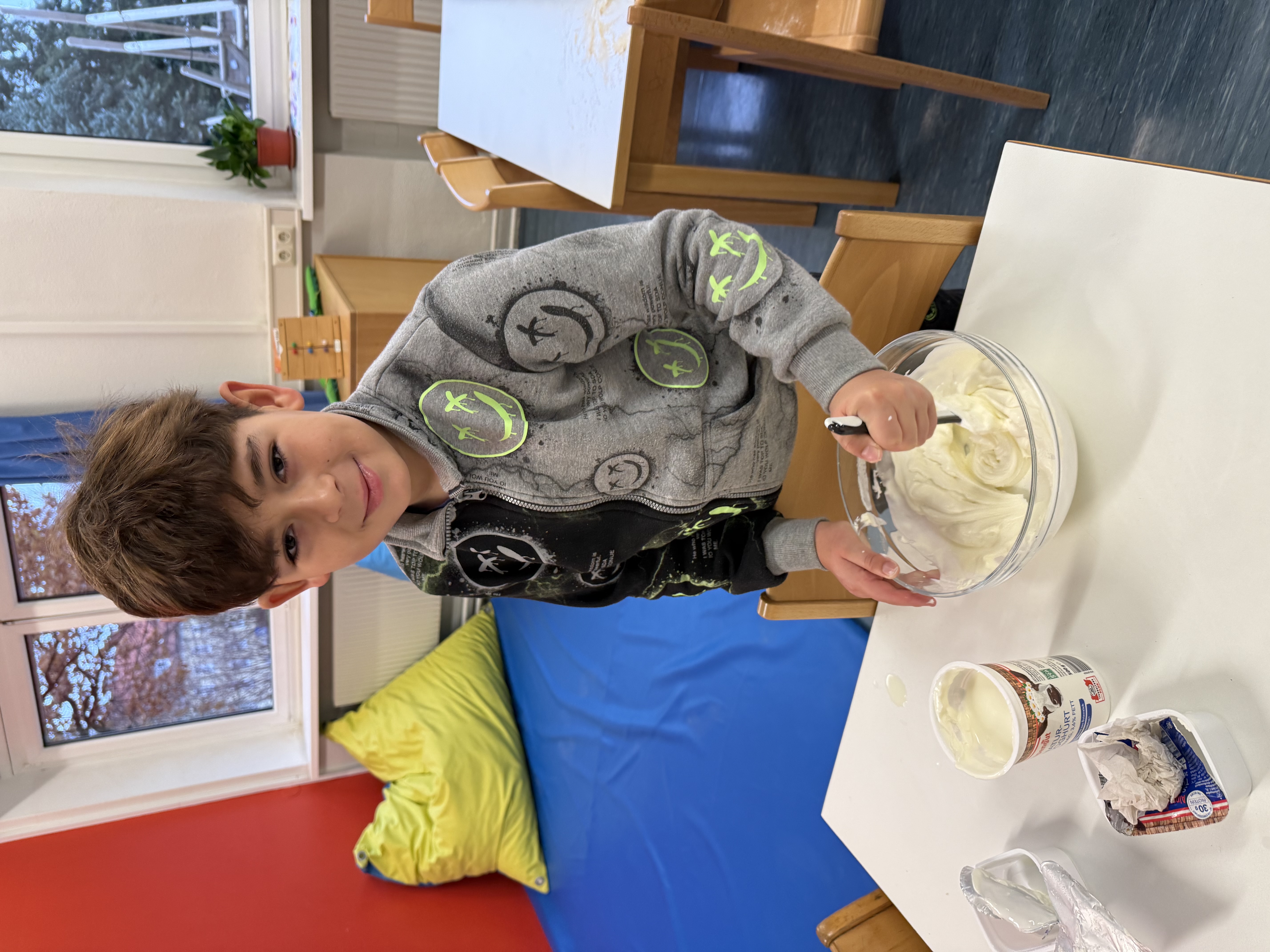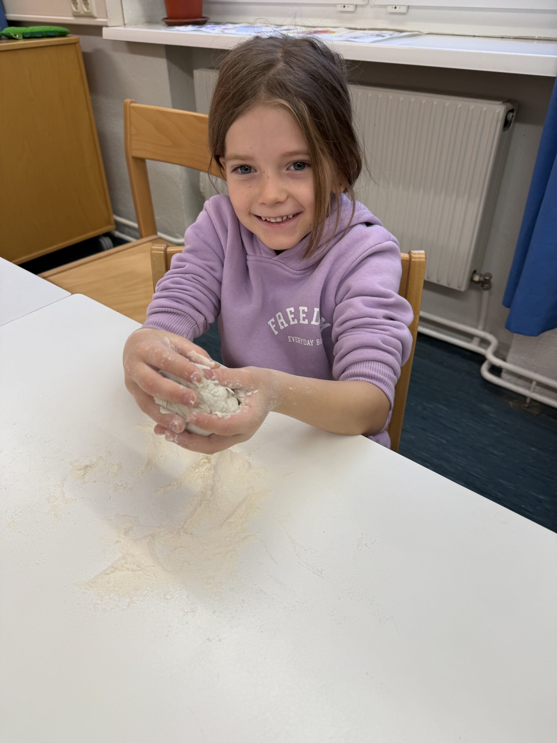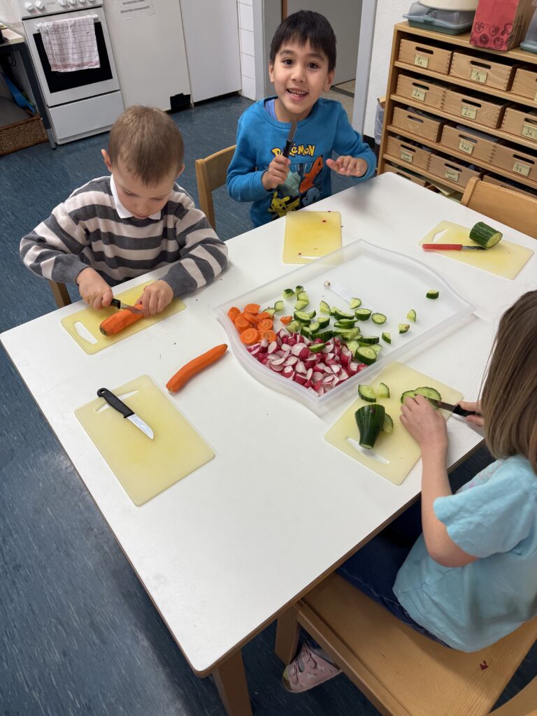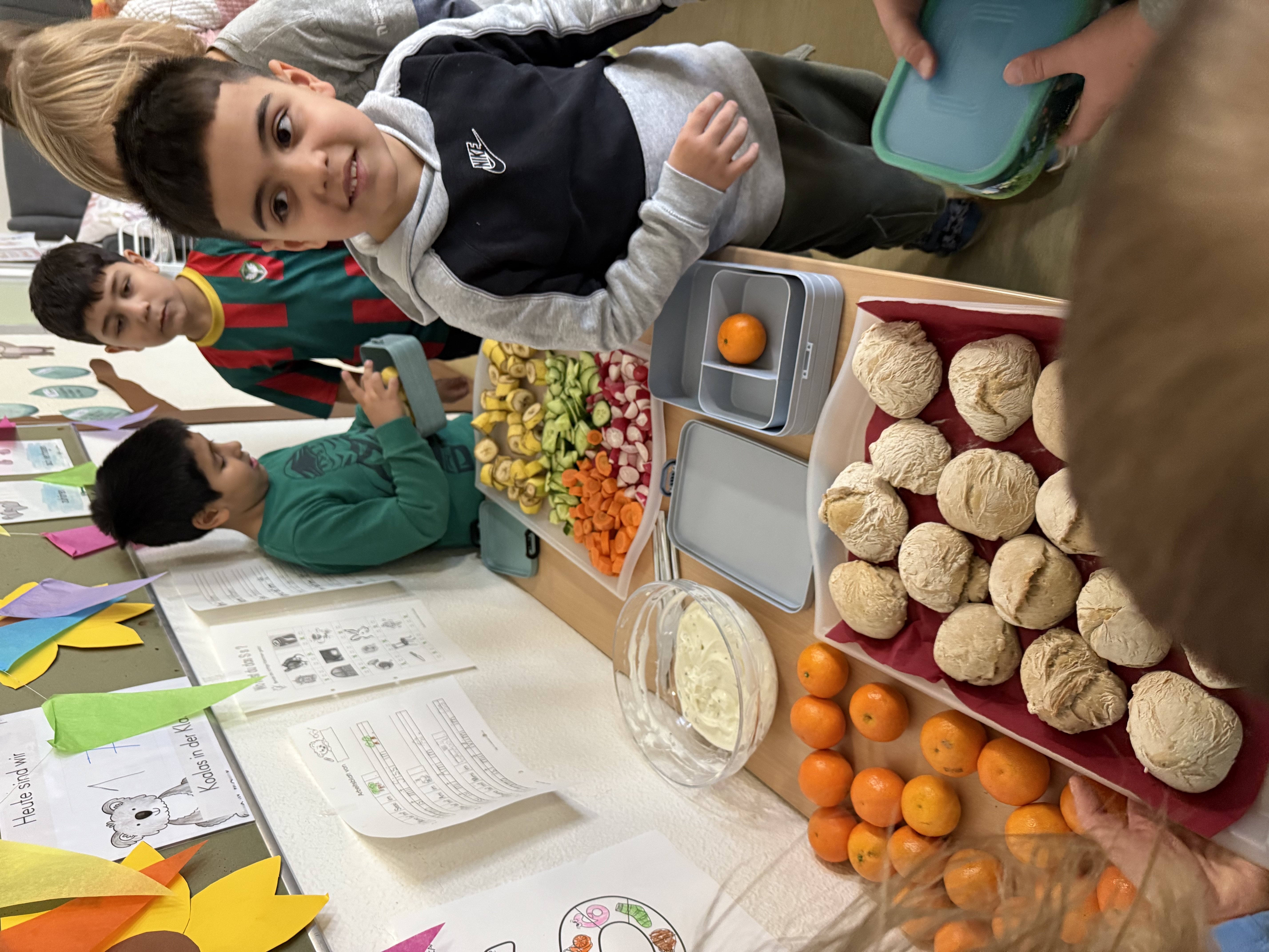 Gemeinsam wird geschnitten, vorbereitet, probiert – und dabei nicht nur gegessen, sondern auch gelernt, Verantwortung zu übernehmen. Ein besonderes Highlight: Heute hat die Klasse ihr eigenes Brot gebacken.